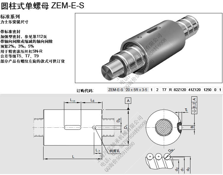 螺母型号额定载荷额定动载C(N)额定静载C0(N)速度1)vmax(m/min)规格尺寸(mm)重量d0xPxDW-id1d2D1D4LL6L7L11BT1mg6±0.10.2P90.1(kg)R15322300222002800158x2.5Rx1.588-37.56.31621653.5631.80.02R153242201224041601212x2Rx1.2-411.710.8212195.53.5831.80.03R153246032380058003012x5Rx...